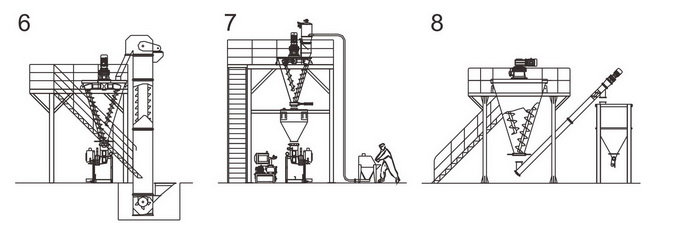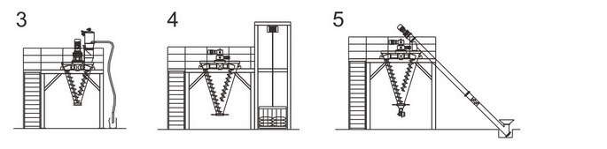 配置3:錐形混合機(jī)架設(shè)平臺(tái),人工投料,二次提升物料入成品倉(cāng),再以包裝;